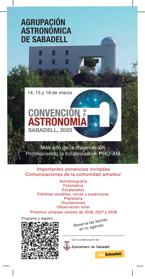 La Agrupación Astronómica de Sabadell organiza para el fin de semana del 14, 15 y 16 de marzo de 2025 una nueva edición de la clásica Convención de Astronomía. Instituida con periodicidad bienal desde el año 1973 solamente quedó interrumpida por la pandemia de la COVID.
