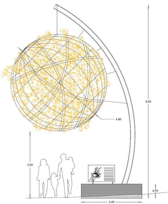 El Sol - Con un diámetro de 4,80m y compuesto de unas 2000 manos de latón, el Sol estará situado en la Rotonda del Árbol Gordo, y Plutón se encontrará a unos 25 kilómetros. Para darte una idea, el diámetro del Sol de la mayoría de los modelos de sistemas solares a escala que puedes encontrar en el mundo gira entre 1 y 2 metros. Los planetas y sus lunas (15 en total) flotarán en unos monolitos compuestos de una base de acero Corten coronada de un cubo de cristal blindado. Cada elemento del sistema estará acompañado de un cartel informativo y una señalética que mostrará donde están los otros elementos del modelo. Los monolitos estarán dotados de un sistema de iluminación interno que permitirá visitar el sistema de noche. |